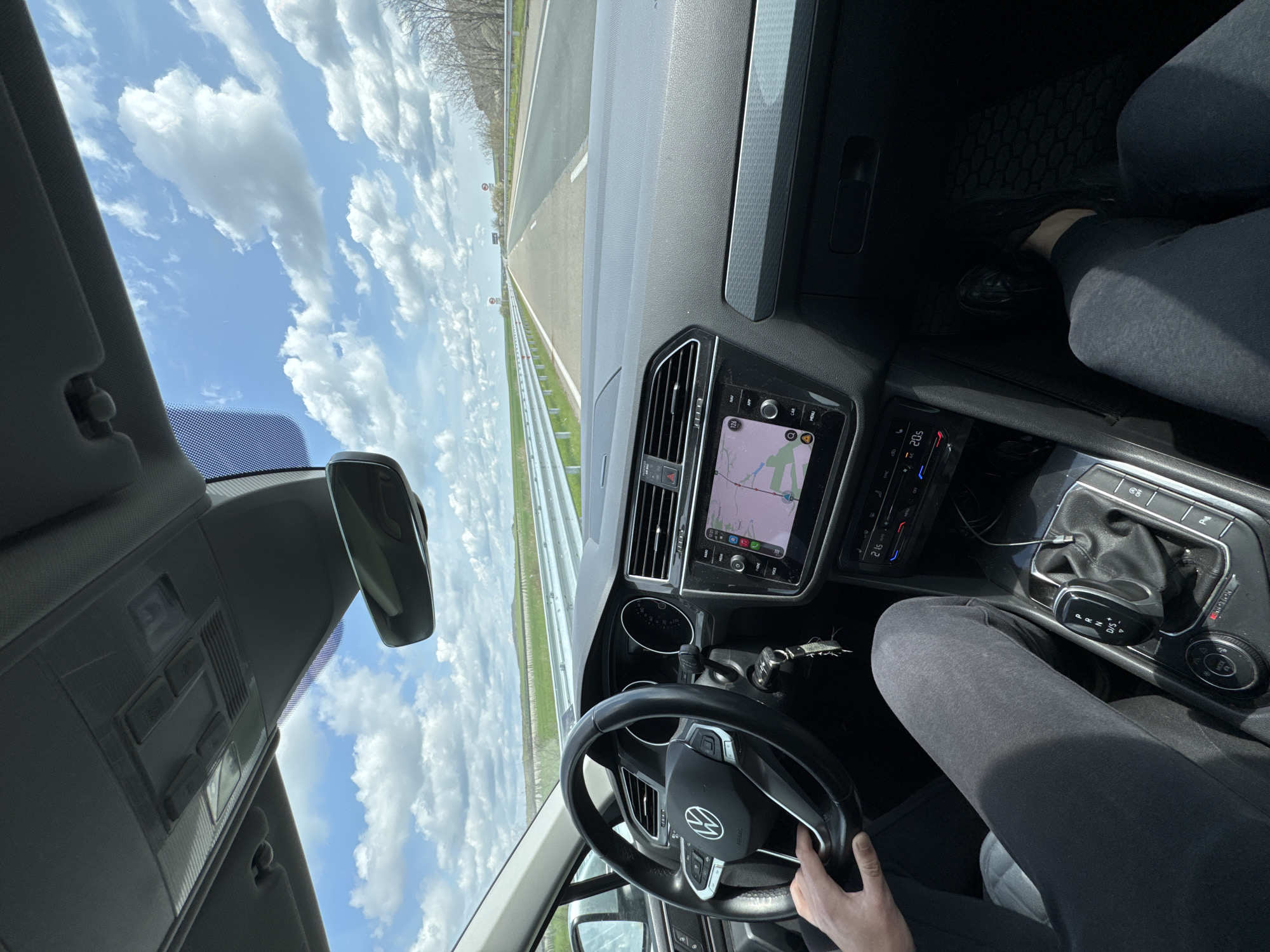 interior of a car driving on a highway. The dashboard features a navigation system displaying a map. The steering wheel is visible, with a hand gripping it. The gear shift is in the "D" position. Outside, the road stretches ahead under a sky with scattered clouds. Based on the visual information available in this image, I cannot ascertain the location of the vehicle to be the city of Vratitsa, Bulgaria. More information would be required.