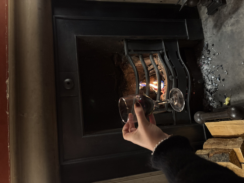 A hand holds a wine glass filled with dark liquid in front of a fireplace. Flames flicker behind the glass, partially obscured by black iron bars. Ashes are scattered on the hearth to the right. Logs are stacked near a black iron poker. The fireplace is framed by a black iron door and a stone surround. A dark sweater with a pearl bracelet on the sleeve is visible.
