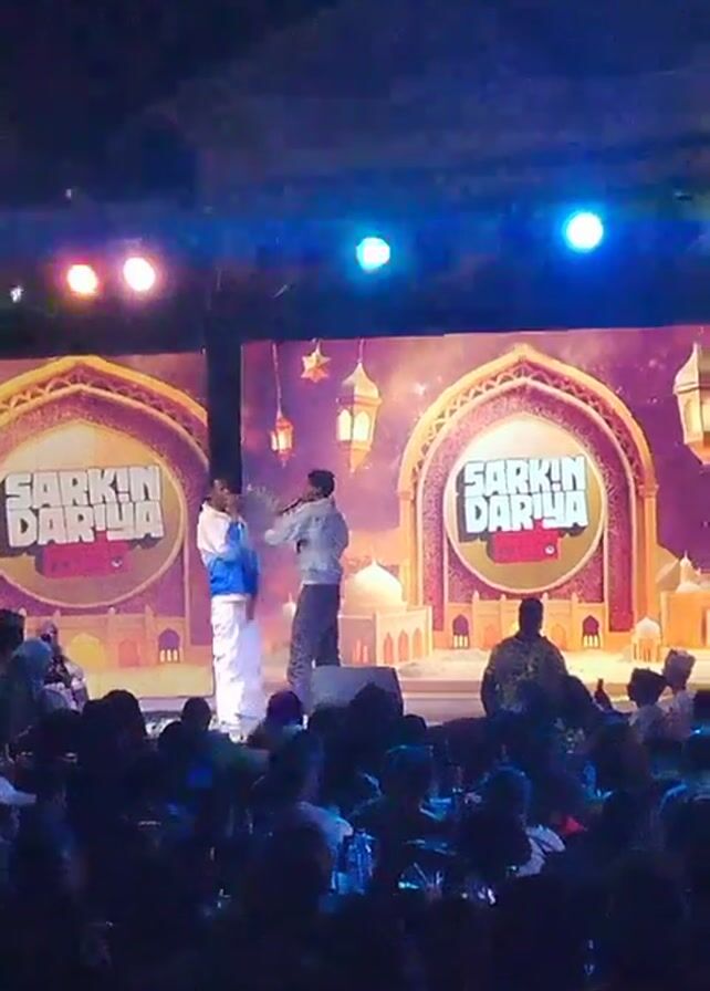 The video captures a live performance on a brightly lit stage. Two men are on stage facing the audience. One man is dressed in a blue and white jacket with white pants. The other man is wearing a light-colored jacket and dark pants. Both men appear to be interacting with each other, one perhaps adjusting the other's microphone. The stage has two large screens that say "Sarkin Dariya." The audience is seated in rows of chairs, facing the stage. Several colorful spotlights illuminate the scene.