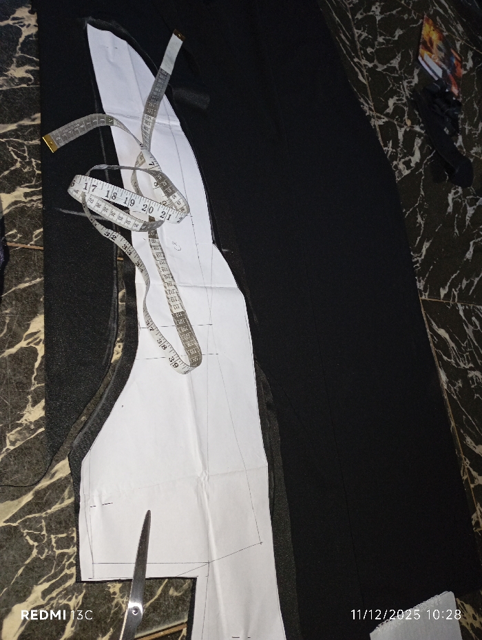 The image displays a flat lay composition centered on tailoring materials. A large piece of black fabric is spread across a dark, marbled surface. Overlaying the fabric is a white paper pattern, folded and marked with pencil lines, outlining a garment component. A white fabric measuring tape, displaying numerical markings including 17 through 21 and 32, 33, 38, 39, is loosely coiled and draped across the paper pattern and fabric. A pair of silver scissors with black handle components is positioned on the lower left of the paper pattern, with one blade visibly inserted beneath the paper, indicating an active cutting process. In the upper right background, a dark, indistinct object and a small, rectangular item with visible colors are present on the marbled surface. No individuals are depicted. The specific location within Bahit, Nigeria, is not discernible from the visual evidence.