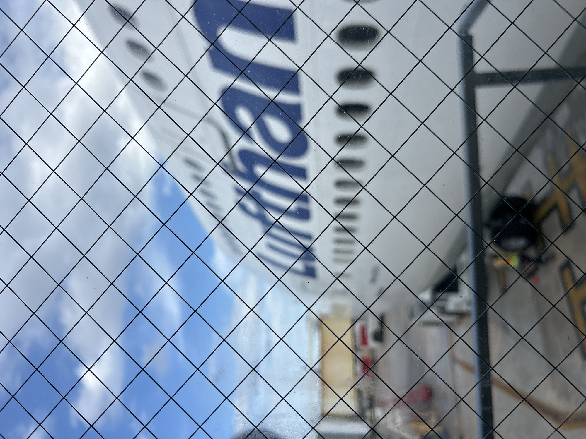- "n airplane, partially visible through a grid-patterned window, located in Davie, United States" by FM-QebQi1, licensed under CC BY 4.0