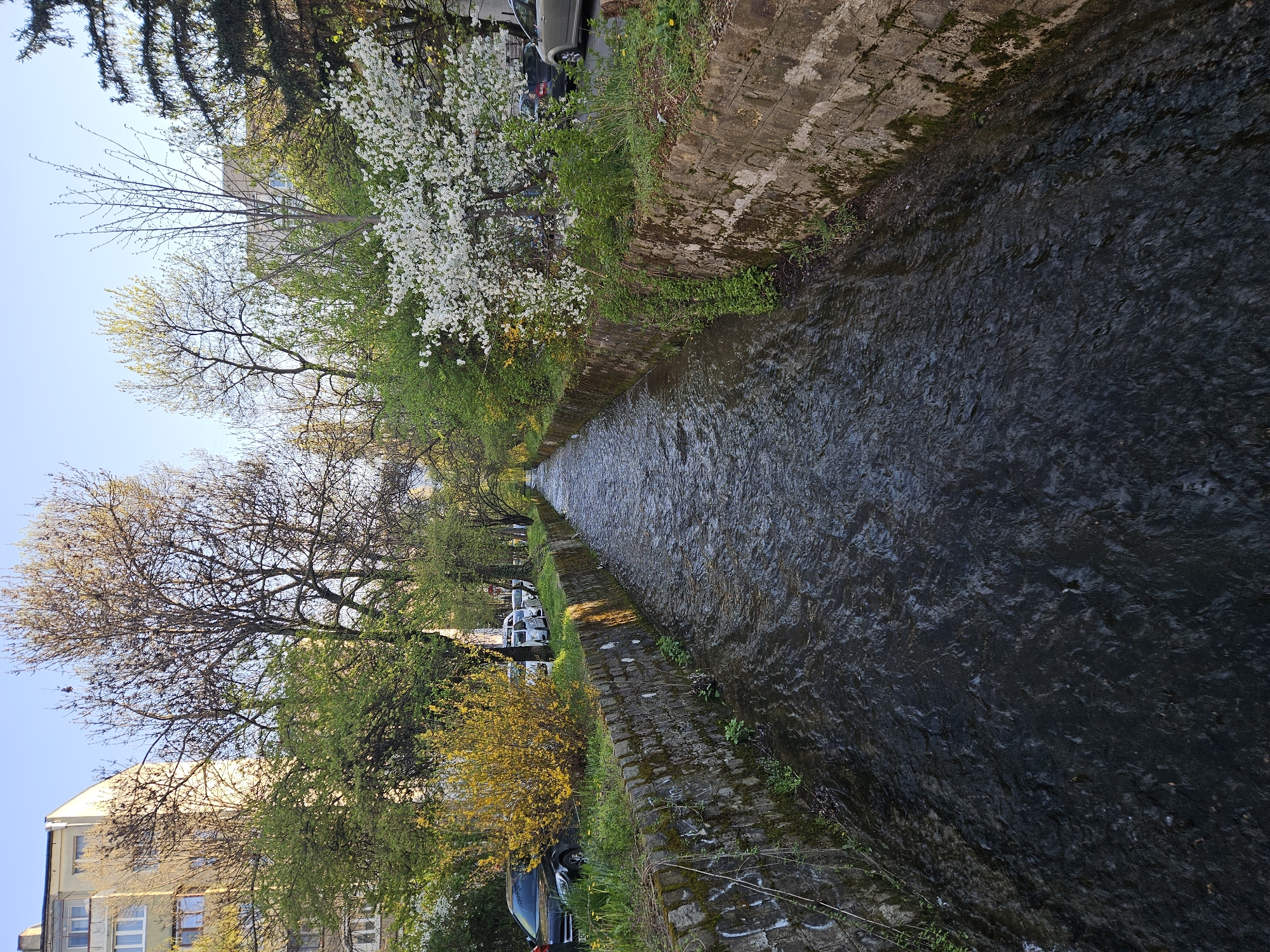 A stream runs through a stone-lined channel