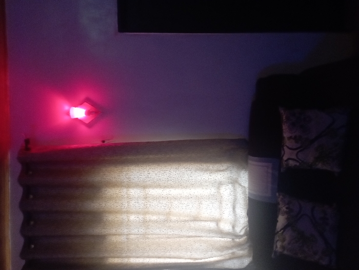 This image captures an indoor scene within the city of Rido, Nigeria. The upper left portion shows a window covered by a light-colored, textured curtain, through which diffuse light from an external source is visible. Centered on the upper right wall is a wall-mounted decorative light fixture emitting a strong red glow. Below the window and spanning the lower half of the frame is a dark-colored sofa. Two patterned throw pillows are positioned on the sofa's seat, and a light-colored throw blanket is draped over its backrest. A dark, vertical object, possibly a piece of furniture, is partially visible on the far right edge of the frame. No individuals are present in the scene.