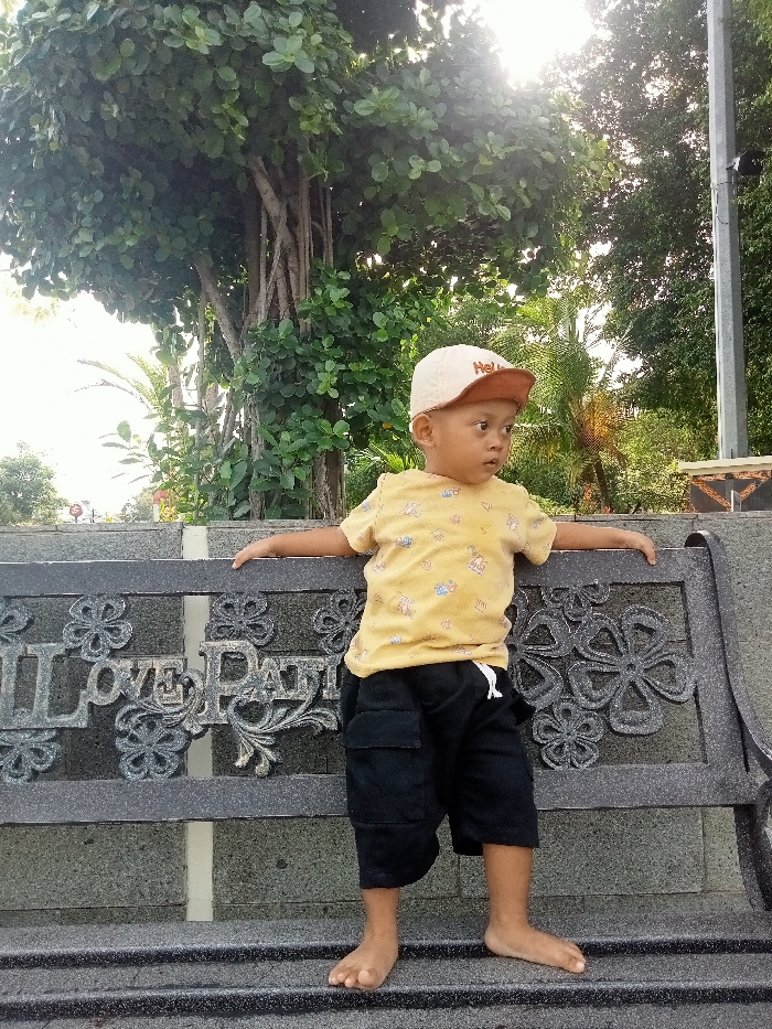 A child stands on a stone bench, facing right. They wear a tan baseball cap, a yellow t-shirt, and black shorts. Their bare feet are visible. The bench features ornate floral and word designs. Lush green foliage fills the background, including a large tree with exposed roots and leaves. Sunlight filters through the trees. A pole is visible to the far right of the scene.