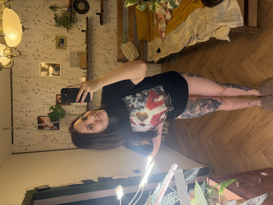 A woman with long brown hair holds a phone, capturing a selfie. She wears a black t-shirt with a graphic design and stands in a room with light patterned wallpaper and a herringbone wood floor. Visible tattoos cover her legs. Background details include a bed with rumpled yellow and patterned linens, shelves adorned with plants and photos, an ornate light fixture, and a plant display with artificial lighting.