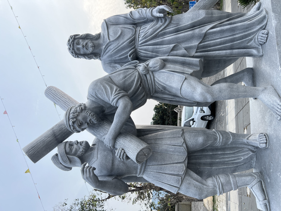 - "Three grey stone statues depicting a Station of the Cross are positioned outdoors" by FM-gZMgt2, licensed under CC BY 4.0