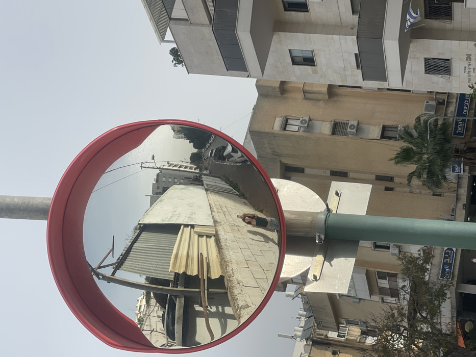 A convex mirror with a red frame is mounted on a green pole reflecting a street scene. The reflection includes a woman, buildings of various heights, a corrugated metal structure, and a street with cars. Outside the mirror's reflection, buildings are also visible. The sky is overcast and muted in color.