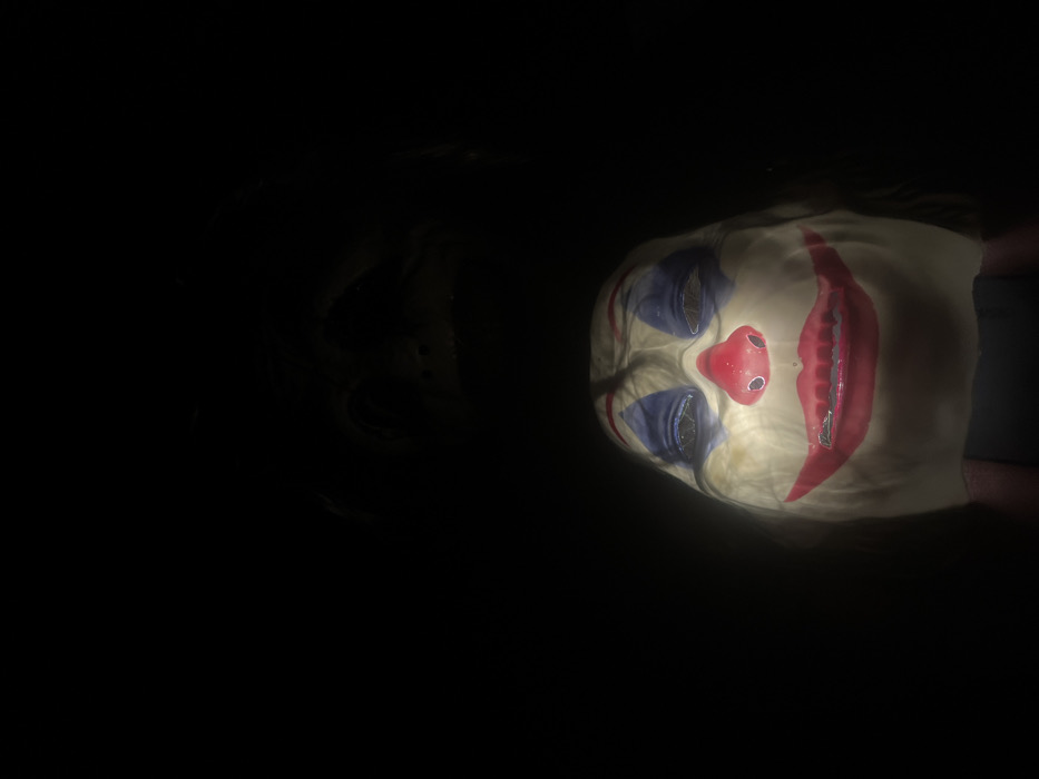 - "A dimly lit image features a clown mask, partially illuminated on the right side against a dark background" by FM-HpdTa2, licensed under CC BY 4.0