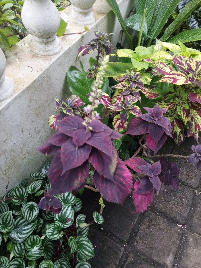 This image captures a close-up view of a cultivated garden or planter area located in Khe Sanh Commune, Vietnam. The scene is dominated by a variety of foliage plants. Centrally, a *Coleus* plant with deep purplish-red leaves, exhibiting subtle pink and green variegation, is prominently featured, with an upright inflorescence bearing small, pale purple flowers. Surrounding this are other *Coleus* plants displaying variegated leaves in patterns of lime green, yellow, and crimson. To the lower left, a dense cluster of *Peperomia argyreia* (watermelon peperomia) is visible, characterized by small, round leaves with distinct light and dark green stripes. In the upper background, larger, glossy green leaves of an unidentified plant are present. A light grey concrete wall or planter edge with three white, weathered baluster-style supports is situated in the upper left background. The ground visible in the lower right consists of dark grey, wet-appearing interlocking paver stones or concrete blocks. No individuals or animals are present, and no specific actions or interactions are depicted. The environment suggests an outdoor setting with diffused lighting.
