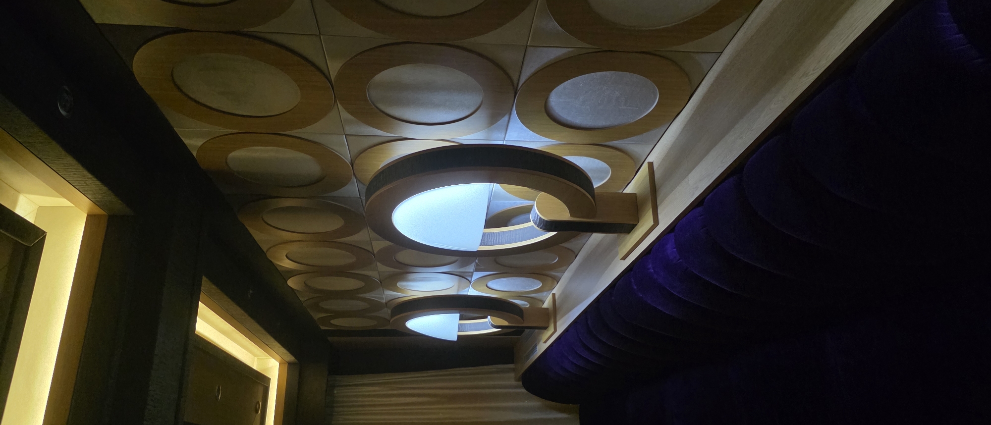 The image depicts the interior of a building, possibly a theater or a similarly designed space, in Sapareva Banya, Bulgaria. The focus is on the ceiling, which features a grid of square tiles, each adorned with a wooden circular design. Two prominent circular light fixtures hang from the ceiling, emitting a bright, white light. On the left side of the image, there are framed openings with light. To the right, there is a dark purple curved surface that looks like a wall.