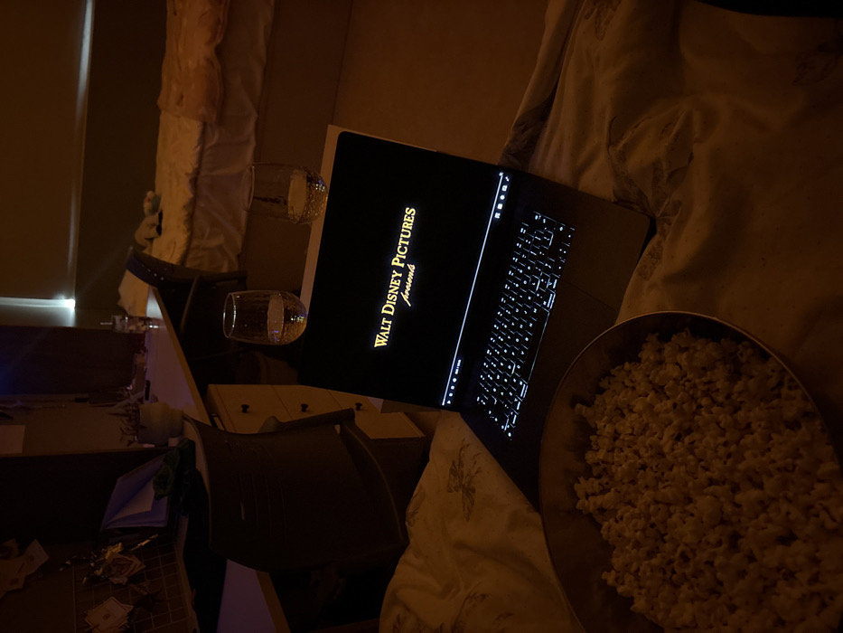 The image depicts an interior room in Getafe, Spain, observed under low-light conditions. In the foreground, a metallic bowl filled with popped popcorn rests on a light-colored, patterned bedsheet. A dark laptop computer is positioned on a soft surface, displaying "WALT DISNEY PICTURES presents" on its screen. The laptop's keyboard is illuminated with white backlighting. Two clear glass tumblers, each partially filled with clear liquid, are located on a light-colored flat surface adjacent to the laptop. In the background to the left, a light-colored desk with a dark office chair is visible. The desk holds papers and a small container; a corkboard with documents is affixed to the wall above it. To the background right, a bed with light-toned bedding is partially visible, positioned beneath a window with a partially drawn blind, emitting a faint light source. No individuals are present in the frame.