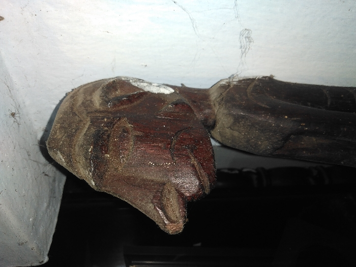 - "The image displays a dark reddish-brown wooden carving of a humanoid figure, viewed from a slightly upward left-profile angle, situated in the city of Phouviang-Gnai, Laos" by FM-oHfK92, licensed under CC BY 4.0