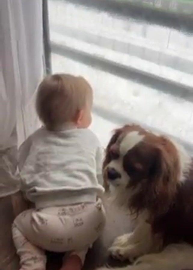 A baby and a dog sit on the floor by a window. The baby is wearing a light gray long-sleeved shirt and printed pants with the words "I LOVE MY DADDY." The dog is a Cavalier King Charles Spaniel, mostly white and tan. They are both looking out the window. Outside the window, it appears to be raining or snowing with a view of buildings in the distance. The floor is wood-look tile. A curtain hangs by the side of the window.