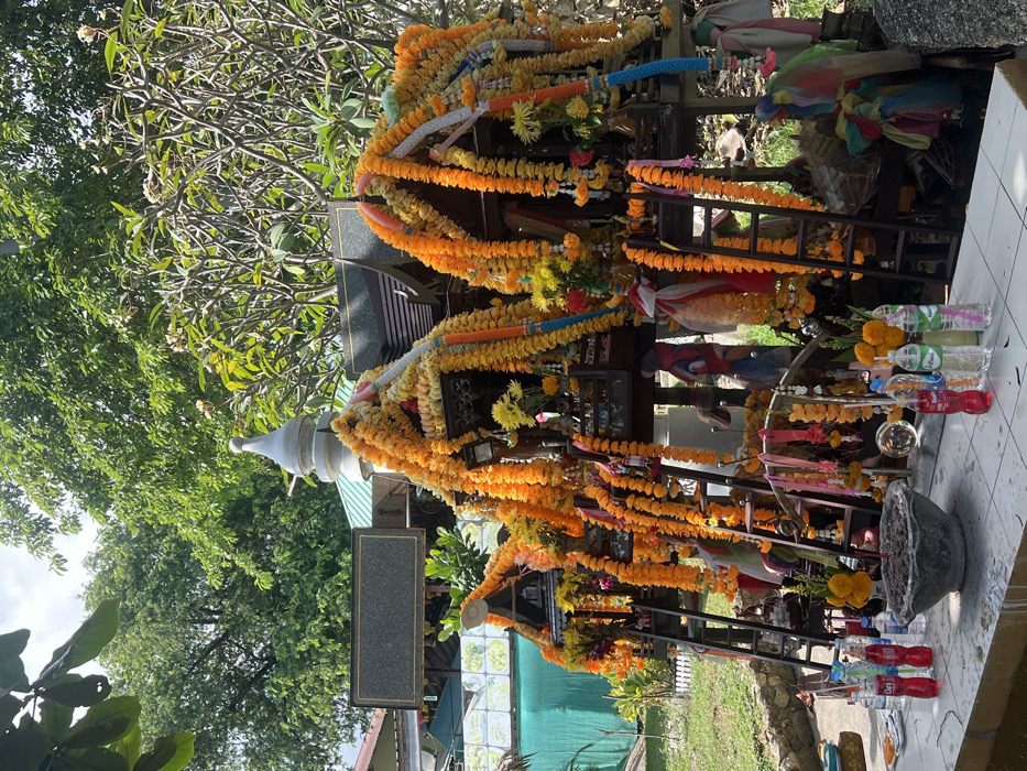 An ornate spirit house sits outdoors, draped in garlands of orange and yellow flowers