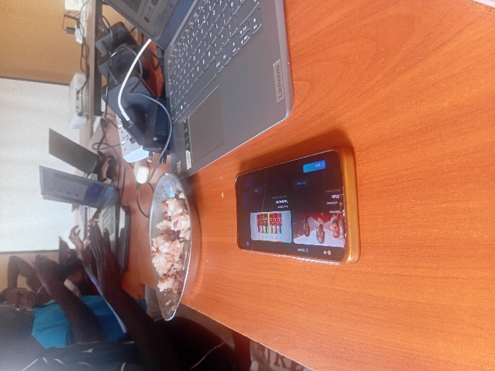 An indoor scene, identified as a classroom or training facility in Unknown, Unknown, depicts a group of individuals engaged with electronic devices at wooden tables. In the foreground, a smartphone with a gold-colored case lies face-up on a light brown wooden table, displaying a media player interface. Adjacent to it on the right is an open silver-colored Lenovo laptop. To the left of the phone, a silver metal plate contains a mixture of reddish-brown and white granular food, resembling rice and beans. Two individuals, appearing to be male and of African descent, are partially visible in the midground on the left. One in a dark shirt has hands positioned above the food plate. The other, in a light blue shirt, is further back with a hand near their head. A multi-outlet power strip with connected chargers and cables, including a white earbud case, is present further back on the table. Two additional open laptops are visible beyond the power strip. In the background, a light-colored wall or projection screen is present, with a white multimedia projector situated on a distant table. Other individuals are partially visible in the background, also appearing to use laptops.