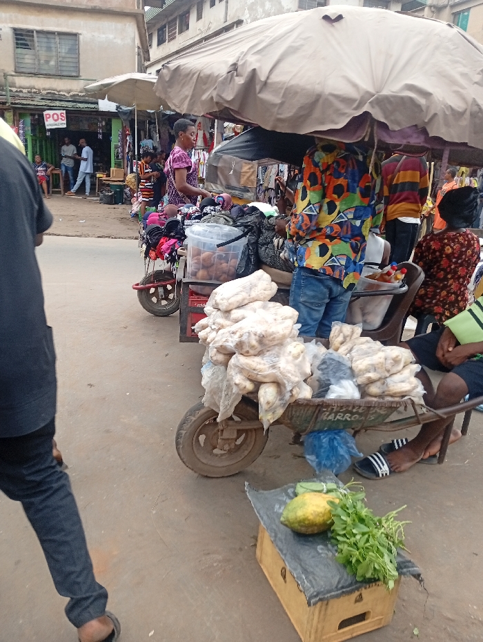 This image depicts a vibrant street scene in a commercial district of Onitsha, Nigeria, characterized by roadside vending and pedestrian activity. In the foreground, the lower half of a person wearing dark trousers and black slides is visible on the left. To the right, a light brown wooden crate, covered by a black tarp, displays a single yellow-green papaya and a bunch of green leafy vegetables. Nearby, a person's bare feet in black and white striped slides are visible. Centrally, a three-wheeled handcart, labeled "BARROW IS," is heavily loaded with numerous transparent plastic bags containing pale, irregular-shaped tubers. A blue plastic bag rests beneath the cart. Behind the cart, a person wearing a brightly patterned shirt (featuring orange, blue, green, and black shapes) and blue jeans stands under a large, beige canvas umbrella, facing away from the viewer. To their immediate right, another individual in a horizontally striped shirt (red, brown, black) is partially visible. Further left, a woman in a purple and white patterned top stands behind a stall, appearing to attend to a display of bras and other clothing items. A clear plastic container holding spherical brown food items (possibly akara or puff-puff) is positioned near her. In the background, a two-story building with a green "POS" (Point of Sale) sign above its entrance is visible. Several men are congregated near and inside this establishment. Another white umbrella is partially visible further down the street. The ground is a worn, paved surface, and the overall environment suggests a busy market day under bright daylight.