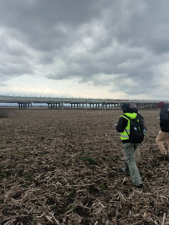 The scene is an open agricultural field in Voluyak, Bulgaria, observed under an overcast, heavily clouded grey sky. A multi-span concrete viaduct or overpass, supported by numerous pillars, traverses the background horizontally, featuring a protective barrier along its upper edge. The field's ground is covered with dense, dry crop stubble and scattered sparse green vegetation. Three individuals are visible in the midground, walking from right to left across the field. The lead person, positioned on the left, wears a neon yellow-green high-visibility vest over a dark jacket, light-colored trousers, and a black backpack with a light blue patch; they are holding a white electronic device. A second person, to the right, wears a dark jacket, tan trousers, and also holds a white electronic device. A third individual is partially obscured directly behind the lead person. Several small, dark avian shapes are discernible in the upper portion of the cloudy sky.