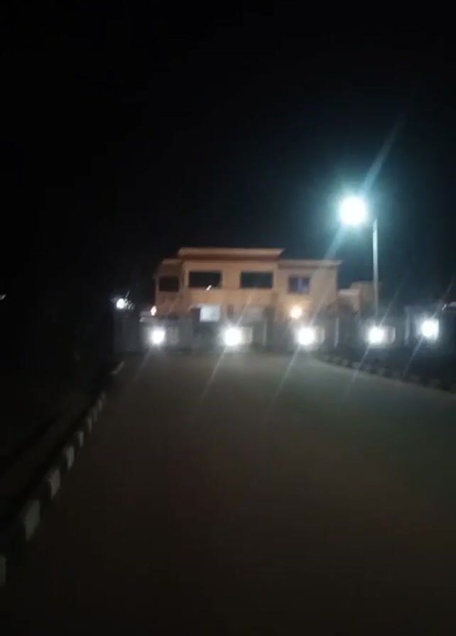 two-story house at night. The house is beige with a flat roof and visible windows. There are several bright lights in front of the house, possibly spotlights or floodlights. A street or walkway leads up to the house, lined with a curb on the left. A streetlamp is visible to the right of the house, casting a bright glow. The overall environment is dark, with the house and lights being the main focal point. The camera is moving slowly closer to the house.