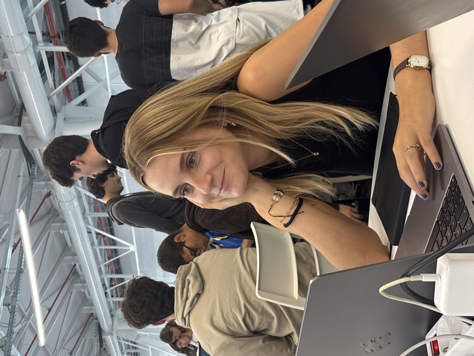This image depicts a modern study hall or common area, specifically identified as being within the Nova School of Business and Economics (Nova SBE) in Carcavelos, Lisbon district, Portugal. The primary subject, a young adult female with long blonde hair, is seated at a white table in the foreground. She is looking slightly to her left (viewer's right) with a subtle smile, her right hand resting under her chin. Her left hand is positioned on the keyboard of a silver-grey laptop (Apple MacBook). She wears a black sleeveless top. Her right wrist is adorned with multiple bracelets, including one with a black cord and another featuring a circular, gold-accented pendant. Her left hand displays dark grey nail polish and a gold-colored ring on her ring finger, while a watch with a rectangular white face and a dark red/brown strap is on her left wrist. A delicate gold-colored necklace with a small pendant and small gold hoop earrings are also visible. A white power adapter is connected to her laptop and plugged into a white power strip. A black notebook or tablet case rests on the table beside her laptop. A second laptop screen is partially visible to her right. In the mid-ground and background, several other young adults, predominantly male, are present. To the immediate left of the main subject, a male in a beige hoodie is seated with his back to the camera, next to a white chair. Behind him, another male with glasses leans over a table. Further back, multiple male figures are standing or walking; one wears a black shirt, another a dark grey hoodie, and one wears a black and white striped t-shirt (white on the bottom half). The environment features a high, industrial-style ceiling with exposed white metal trusses, utility pipes, and multiple long, horizontal fluorescent light fixtures, providing bright illumination. The furniture consists of white tables and white chairs, characteristic of a contemporary academic or collaborative workspace.