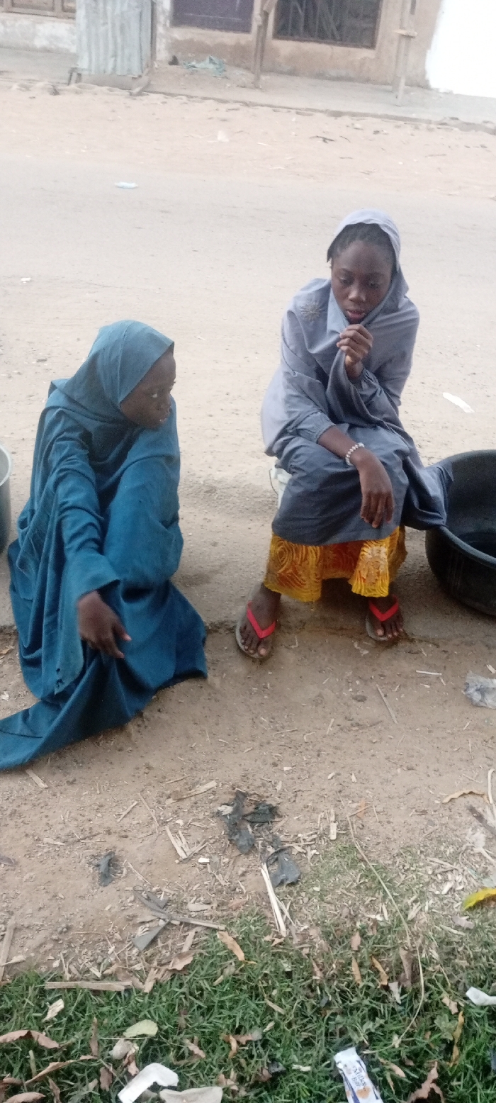 Two young women sit outside. One, wearing a blue robe and hijab, squats on the ground. The other, dressed in a gray robe and hijab with a yellow patterned skirt and red flip-flops, sits on something unseen. A bucket is next to the seated woman. They appear thoughtful or solemn. The ground is dirt with patches of grass and trash. A building is in the background, suggesting an urban or village setting.