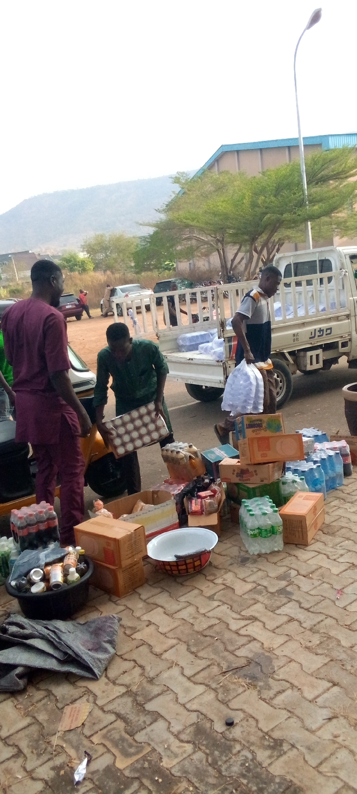 Three men unload a white pickup truck filled with water bottles. One man carries bags of water, another holds a crate of eggs. The ground is covered with supplies: boxes, bottled drinks, canned goods in a black bucket, and a white enamel bowl. The scene takes place on a paved area, with mountains, a building, and other parked vehicles visible in the background. A streetlight stands tall nearby.