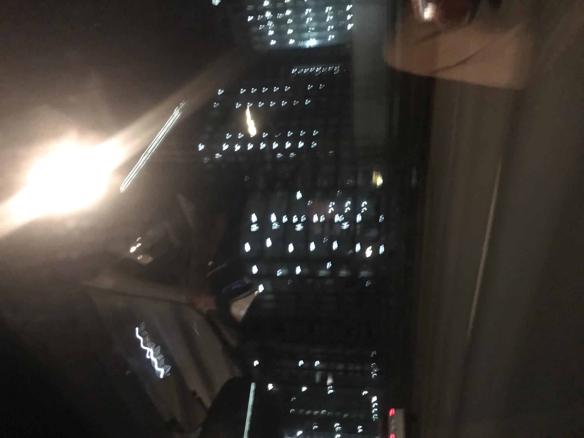 This image depicts an urban night scene, captured from the interior of a moving vehicle, evidenced by motion blur and reflections on a glass surface, likely a windshield