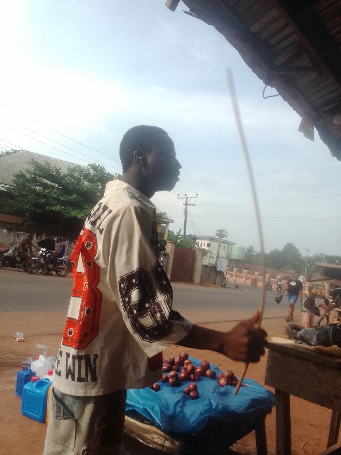 A man stands at a roadside stall selling onions. He wears a white shirt with large numbers and the words "BE WIN" on the back. The onions are piled on a blue tarp. He holds two long, thin sticks in his hand. Behind him, a road stretches into the distance with people, motorcycles, and houses visible. A partial view of a roof is in the upper right corner.