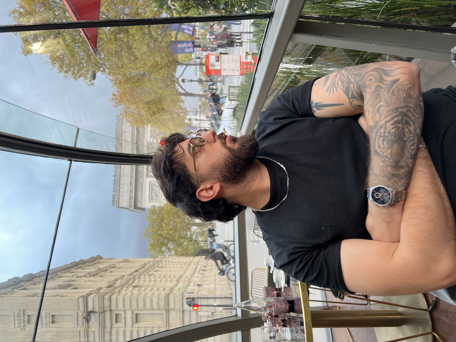 An adult male with dark, mullet-style hair, a beard, and round glasses is seated at a table inside a glass-enclosed establishment. He wears a black t-shirt, a silver chain, and a silver mechanical watch on his left wrist. His left arm is extensively tattooed, featuring intricate patterns and a distinct symbol on the upper arm. His arms are crossed as he gazes towards the right. On the table to his left are glasses, a glass water bottle, and a white cup. Through the glass, the scene is set in Paris, France. The iconic Arc de Triomphe is prominently visible in the background under an overcast sky. To the left of the Arc, a large, light-colored classical building stands. The street scene includes pedestrians, a person on a blue bicycle, and trees displaying autumnal foliage. A red traffic light is visible on the left. The foreground exterior features green plants and a partial red awning.