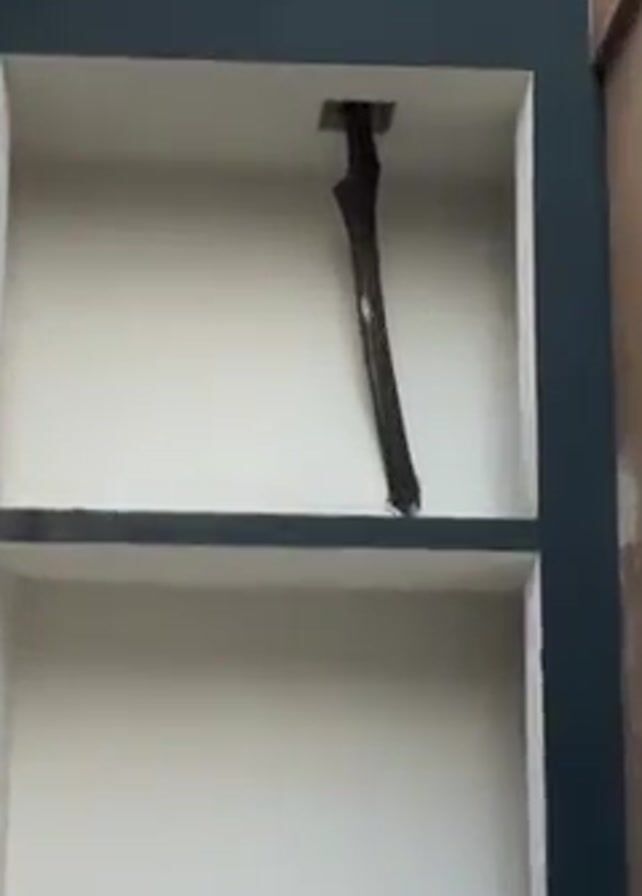 building facade with a tree branch sticking out of a square hole in the wall. The wall is painted in a two-tone color scheme of grey and white. The branch is brown and appears to be dead. Above the wall, the top of a tree is visible, extending higher than the facade. In the background is an older building with balconies and several floors. Clothes are hanging on some of the balconies. The ground is paved. The video slowly pans up the branch towards the top of the tree.