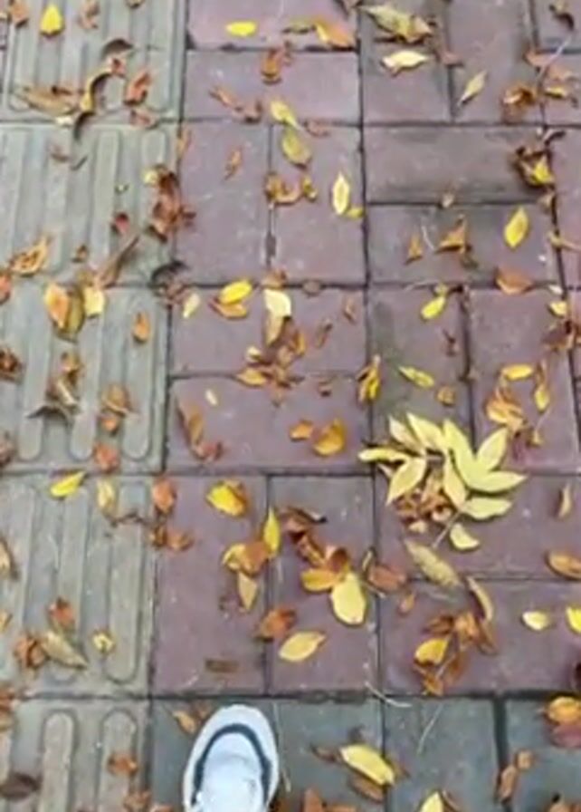 person walking on a paved sidewalk covered in fallen autumn leaves. The sidewalk is made of rectangular red and gray stones. The leaves are mostly yellow and brown. The person is wearing white sneakers with blue accents. The camera angle is from the person's perspective, looking down at their feet and the sidewalk. The leaves crunch as the person walks.
