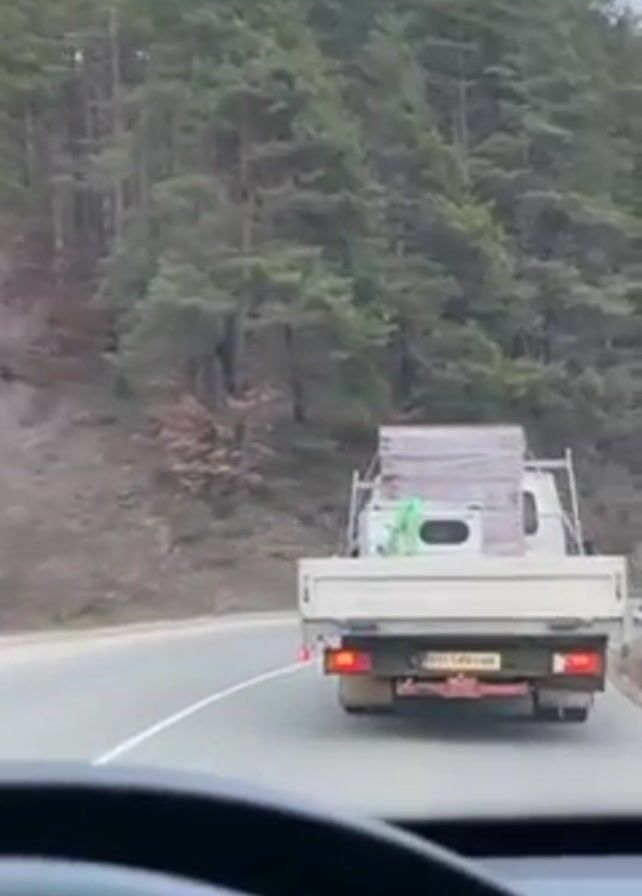 car's perspective while driving on a curved road, following a white pickup truck. The truck is carrying a load secured with straps, including what appears to be a refrigerator. The road is lined with evergreen trees on the left side, and the sky is overcast. The truck's license plate is visible, reading "EH 1491 MK". The car's dashboard and steering wheel are partially visible at the bottom of the frame.