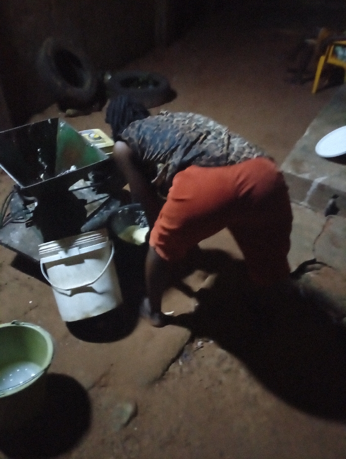 An individual is observed from behind, bent over a dark-colored grinding machine in a dimly lit, unpaved outdoor or semi-outdoor area within the city of Unknown, Unknown. The person wears a dark, patterned short-sleeved top and orange trousers, with dark, possibly braided hair. Their hands are positioned near a dark bowl collecting material from the machine's output. A light-colored plastic bucket is on the ground to the left of the machine, and a smaller, light-green bowl containing a light-colored substance is in the immediate foreground. Two worn vehicle tires are visible in the left background. To the right, a white plate rests on a low, dark structure, and part of a yellow plastic chair is visible further back. The ground is composed of reddish-brown earth.