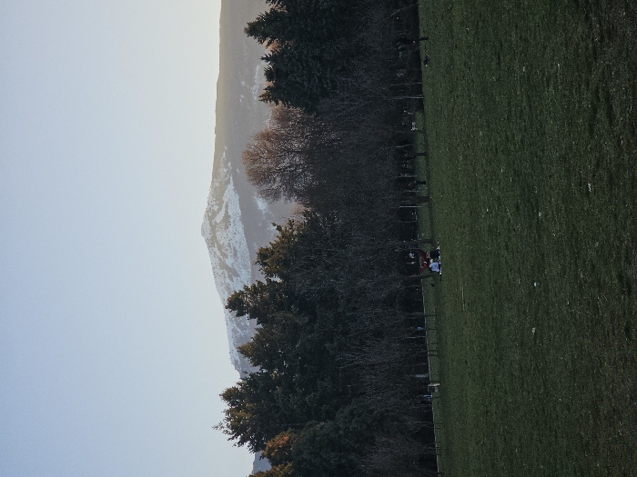 The image presents a wide view of a large green space, likely a park, located in Sofia, Bulgaria, facing towards the Vitosha Mountain. The upper background features the snow-capped peak of Vitosha Mountain, brightly illuminated under a clear, pale blue sky. Below the mountain, a dense line of dark green coniferous trees extends across the mid-background, partially obscuring the mountain's base. In front of these, a row of deciduous trees, predominantly bare, forms another line across the midground. The foreground is an expansive area of dark green grass. In the midground, slightly to the left of the center, a group of approximately three to four individuals is seated or lying on a light-colored blanket spread on the grass. One person wears a light-colored top, another a dark red top. A red object, possibly a bag or additional blanket, rests near them. These individuals are static, engaged in leisure. Further to the right and deeper into the scene, additional indistinct figures are visible among the trees and at the edge of the grassy area, suggesting other park visitors. The lighting indicates late afternoon or early evening, with the mountain receiving direct sunlight while the foreground and midground are in shadow. No specific actions, interactions, or prominent artificial objects beyond the individuals and their picnic items are discernible.
