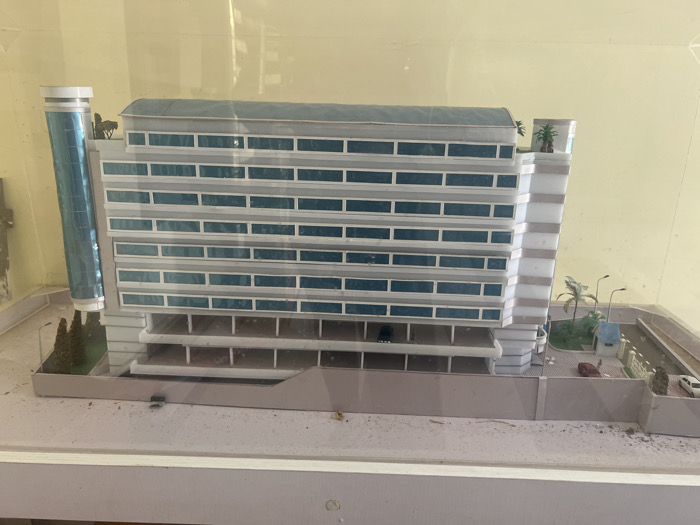 This image displays an architectural scale model of a multi-story building, presumably representing a structure located in Jos, Nigeria