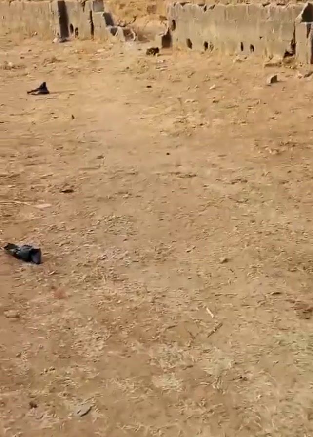 sparsely vegetated, dirt and straw-covered area. In the background, a building structure is visible. Closer to the camera, a few scattered objects resembling shoes or pieces of clothing are lying on the ground. The ground appears dry and barren. The overall scene suggests a neglected or abandoned outdoor space.