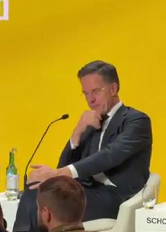 man wearing a suit and glasses sitting in a white chair on a stage with a yellow backdrop. He is speaking into a microphone. There is a bottle of water on the table next to him. The word "SCHOOF" is visible on the front of the table. There are people sitting in the audience in front of him. The words "INIAN B" are partially visible on the backdrop behind him. The man pauses and looks off to the side while speaking.
