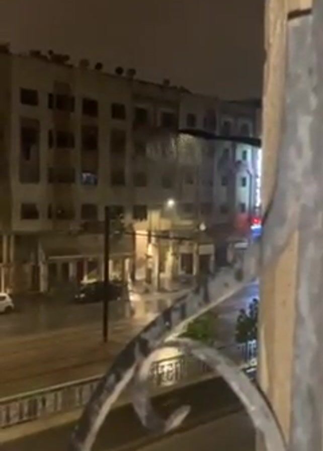 nighttime scene of a city street during a heavy rainstorm, filmed from an elevated position, possibly a window or balcony