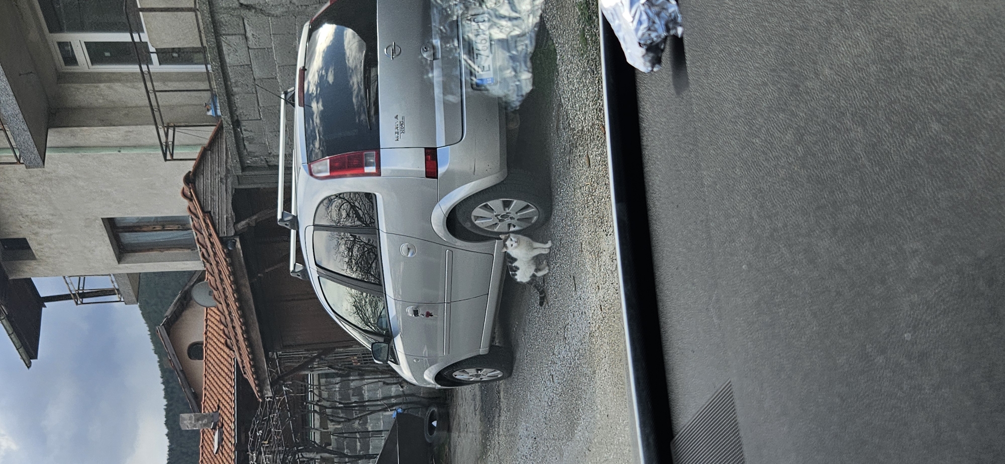 The image displays an outdoor residential scene in Jeleznitsa, Bulgaria, captured from inside a vehicle, evidenced by a dark grey dashboard and a crumpled piece of aluminum foil visible in the immediate foreground. A silver Opel Meriva A minivan, identifiable by its model badge and featuring roof rails, is parked on a light grey gravel surface. The vehicle's rear license plate reads "E 7666 HC", indicative of Bulgarian registration. A predominantly white domestic cat with black patches on its back and tail stands on the gravel near the minivan's rear passenger-side wheel, facing the viewer. A red-colored keychain hangs from the driver's side door handle. In the background, multiple residential buildings are visible, including a multi-story structure with a light stucco facade, windows, and balconies with metal railings, and another building with a terracotta tiled roof, a chimney, and a small satellite dish. Dark green coniferous trees cover a hillside behind the structures, and the sky is overcast.