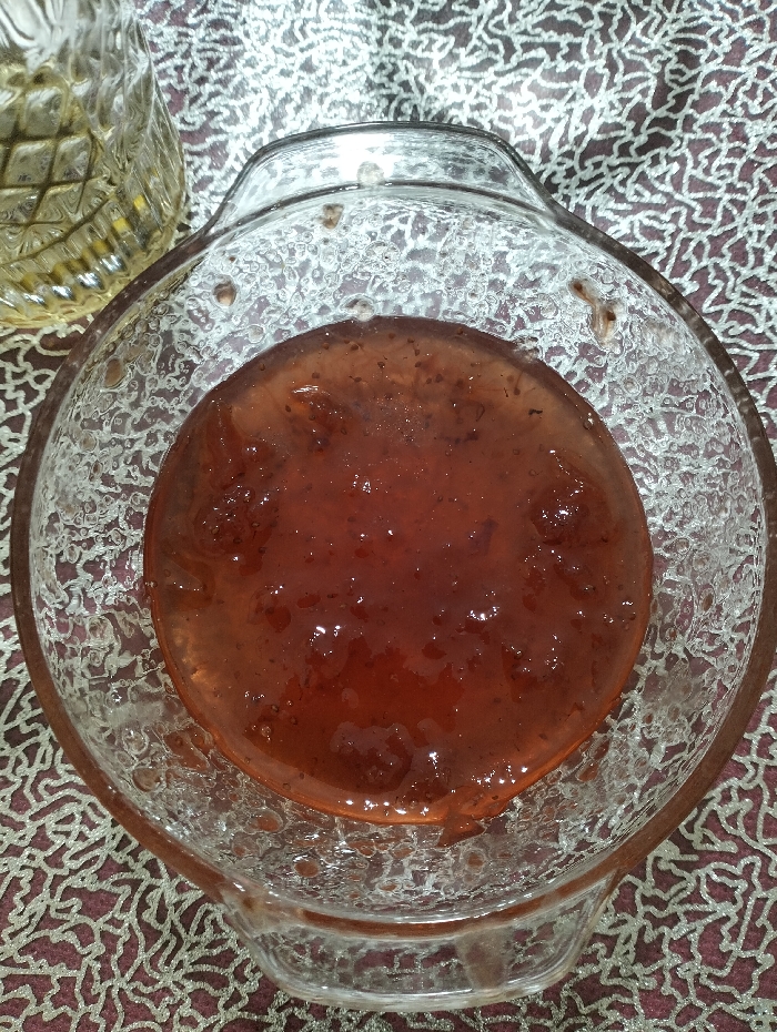 A glass bowl holds a glistening, reddish-brown jelly or jam