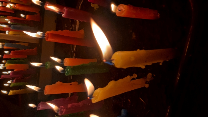 - "A close-up shot reveals numerous colorful candles, mostly in orange, yellow, green, and purple hues, affixed to a dark surface" by FM-yVc162, licensed under CC BY 4.0