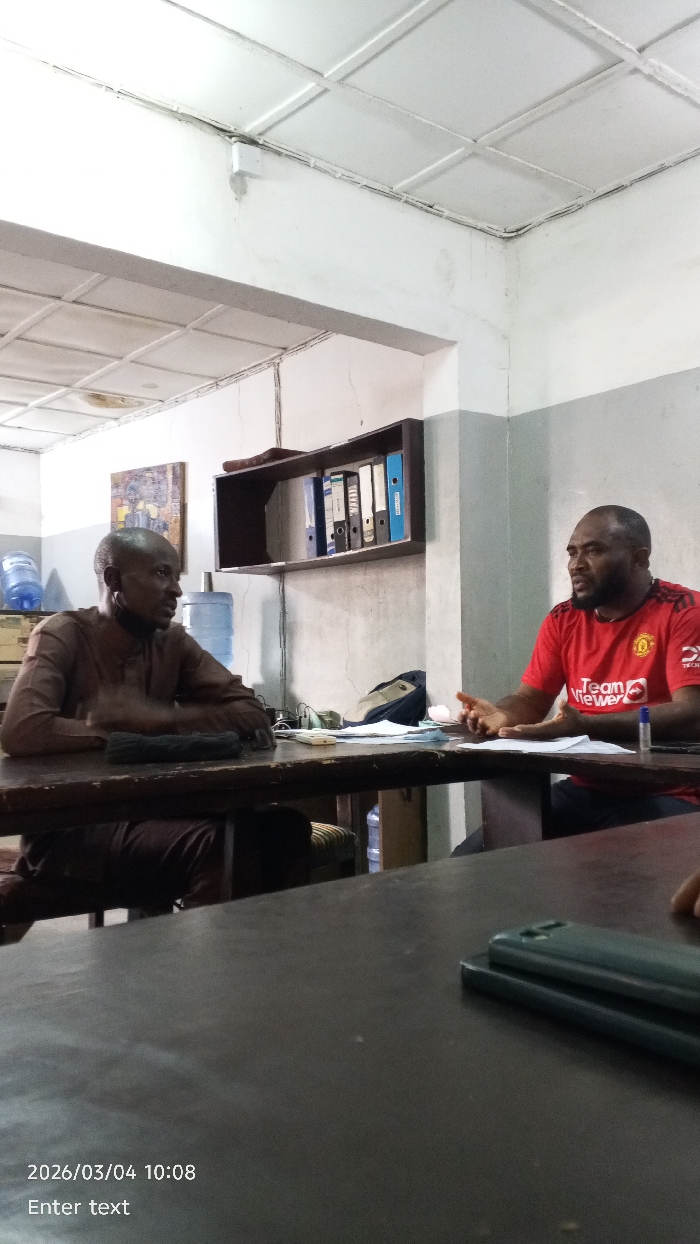 On 2026/03/04 at 10:08, an indoor scene in Dakata, Nigeria, depicts two adult males seated across a dark wooden table, engaged in conversation
