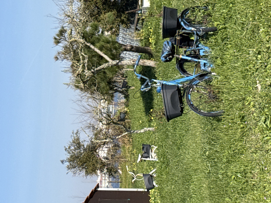 The image depicts a static outdoor scene in Praia de Mira, Portugal, under clear daylight conditions. In the immediate foreground, a weathered blue bicycle is positioned in tall, vibrant green grass mixed with small yellow wildflowers. This bicycle has black rectangular planter baskets affixed to both its front handlebars and its rear rack. The seat is covered with what appears to be a black, crinkled material. In the midground, to the left of the blue bicycle, two white bicycle frames are partially visible, also standing in the grass and repurposed with black planter baskets. The overall area is characterized by an unkempt grassy field. Further in the background, a variety of trees are present, including some deciduous trees with bare branches and some evergreen trees with green foliage. A small, dark brown shed with a white trim is partially visible on the far left edge of the frame. Beyond the trees, a body of water is discernible, likely the Ria de Mira or an associated lagoon, with what appears to be distant buildings or structures along its far bank. The sky above is clear and blue, with a faint white contrail visible. No people are present in the scene.