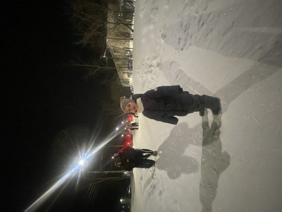 The image presents a nighttime outdoor scene in Chaikovsky, Russia, under heavy snow cover. A young child, estimated to be between three and five years old, stands in the foreground, centrally positioned, wearing a dark blue padded winter coat, dark pants, dark boots, a light grey beanie with ear-like features, and a white scarf. The child's mouth is open, and their gaze is directed slightly left of the camera. Long shadows of the child are cast on the snow. In the midground, two adult figures, dressed in dark winter clothing, are walking away from the camera on a partially cleared snow path. Multiple additional indistinct figures are visible further down the street near red traffic lights. The scene is illuminated by several streetlights, with one prominent streetlight to the left exhibiting significant lens flare. Bare trees line the street, and light-colored buildings are partially visible in the background to the right. Snow covers the ground extensively, forming drifts alongside the cleared walking areas.