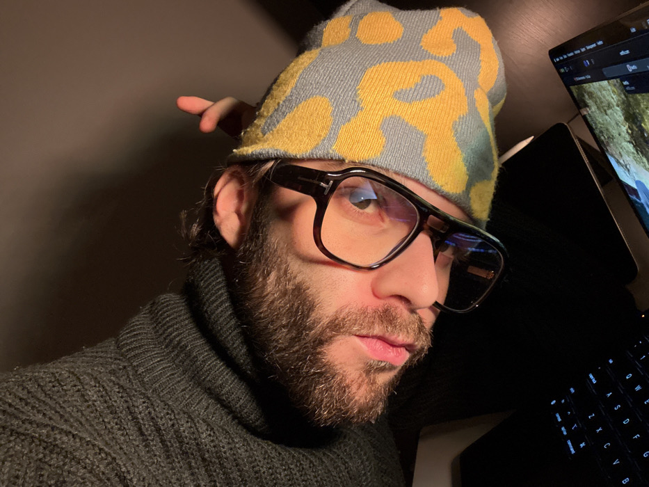 A man wearing a gray turtleneck sweater, a gray and yellow patterned beanie, and large black glasses looks pensively at the camera. The lighting is dark, casting shadows across his face. He has a beard and some hair showing from beneath the beanie. To the right, a laptop and a tablet are visible. There is a hand positioned behind the beanie, giving the impression of small ears.