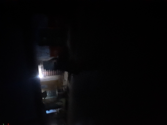 A glimpse into a dimly lit, potentially inhabited space is partially visible through a darkened foreground. Hints of light reveal what appears to be a building interior, possibly an apartment, with a balcony or railing structure and indistinct furniture. The surrounding darkness obscures details, focusing attention on the sliver of interior revealed.