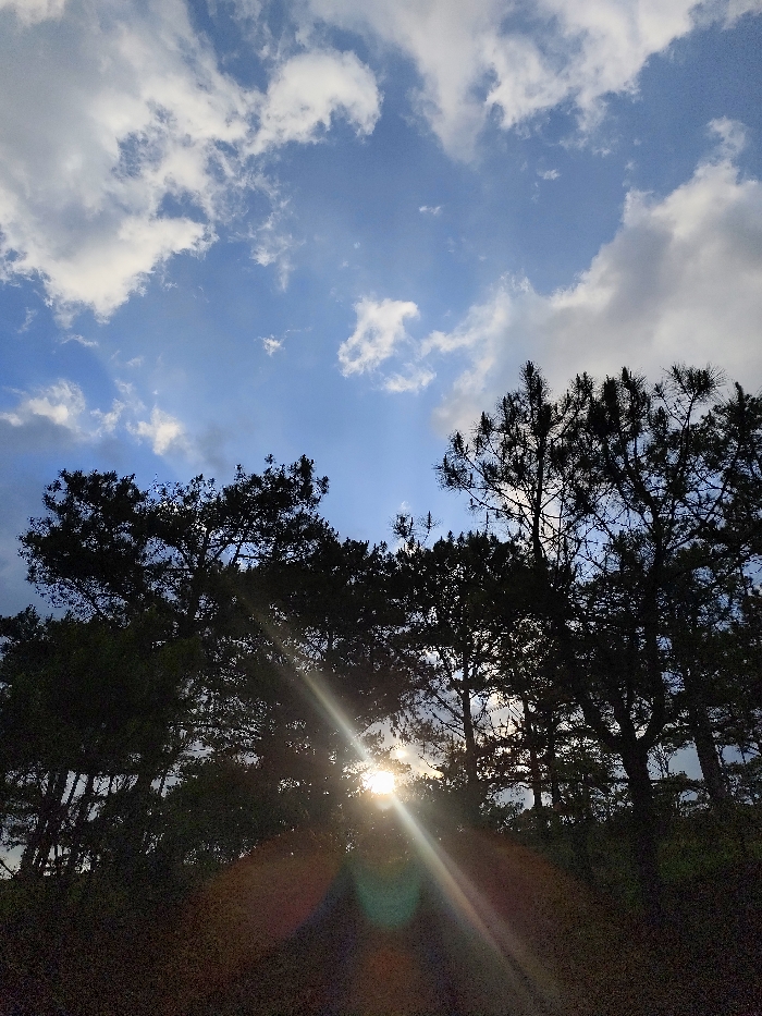 The image presents an outdoor natural scene in Lạc Dương, Vietnam. The upper two-thirds of the frame consist of a blue sky, partially obscured by scattered white and light grey cumulus clouds. The lower third is dominated by a dense, dark silhouette of numerous coniferous trees, consistent with pine species, whose upper canopy and branches are visible. A bright light source, identified as the sun, is positioned centrally behind the trees, creating strong sunbeams that radiate outwards and a prominent multi-colored lens flare extending towards the bottom of the frame. The lighting suggests either early morning or late afternoon, with the sun low on the horizon, backlighting the trees. No human figures, animals, or man-made objects are discernible within the visible area.