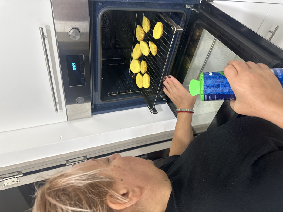 The image displays an indoor kitchen scene located in Yerevan, Armenia. An adult female, with light-colored hair pulled back, is visible in profile from the chest up, observing a stainless steel and black glass built-in electric oven. She is wearing a dark, long-sleeved top. Her right hand, featuring dark nail polish, is placed on the edge of the open oven door. Her left hand holds a blue and green spray container, partially labeled "del," pointed towards the oven's interior. Inside the oven, a metal rack, partially pulled out, holds approximately eleven to twelve pieces of cut, yellow-fleshed potatoes. The oven's digital display shows the time "18:09." White kitchen cabinetry is present above and to the left of the oven, with a door frame and visible hinges on the far left of the composition.