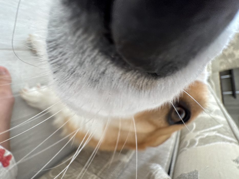 - "A close-up, low-angle indoor photograph captured in село имени 9 Января, Russia, depicts the muzzle and right eye of a dog positioned extremely near the camera lens" by FM-IOQzf1, licensed under CC BY 4.0
