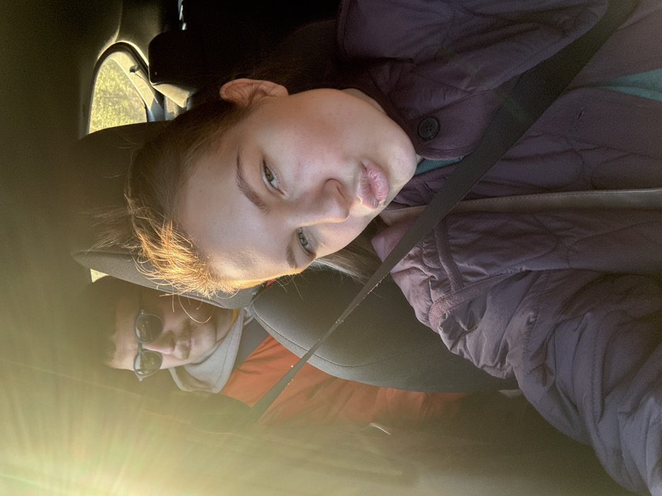 The image depicts two individuals seated inside a vehicle, with the location identified as Nerin, Montenegro. In the foreground, a female subject is positioned towards the right side of the frame, presumably in the front passenger seat. She has light-colored hair, pulled back, and is wearing a dark purple quilted jacket over a teal garment. Her head is slightly tilted, and her lips are pursed in a 'kissing' expression, directed towards the camera. A dark seatbelt extends diagonally across her chest. Behind her, partially obscured and positioned towards the left, is a male subject, presumably in the driver's seat. He has dark hair, a visible mustache, and is wearing dark sunglasses. He is dressed in an orange jacket over a lighter hooded layer and is also secured by a dark seatbelt. Intense bright sunlight streams into the vehicle from the left side, causing significant lens flare and illuminating the female's hair and the right side of her face. The interior of the vehicle appears dark-toned. Through the rear window, blurred green foliage is visible, indicating an outdoor setting.