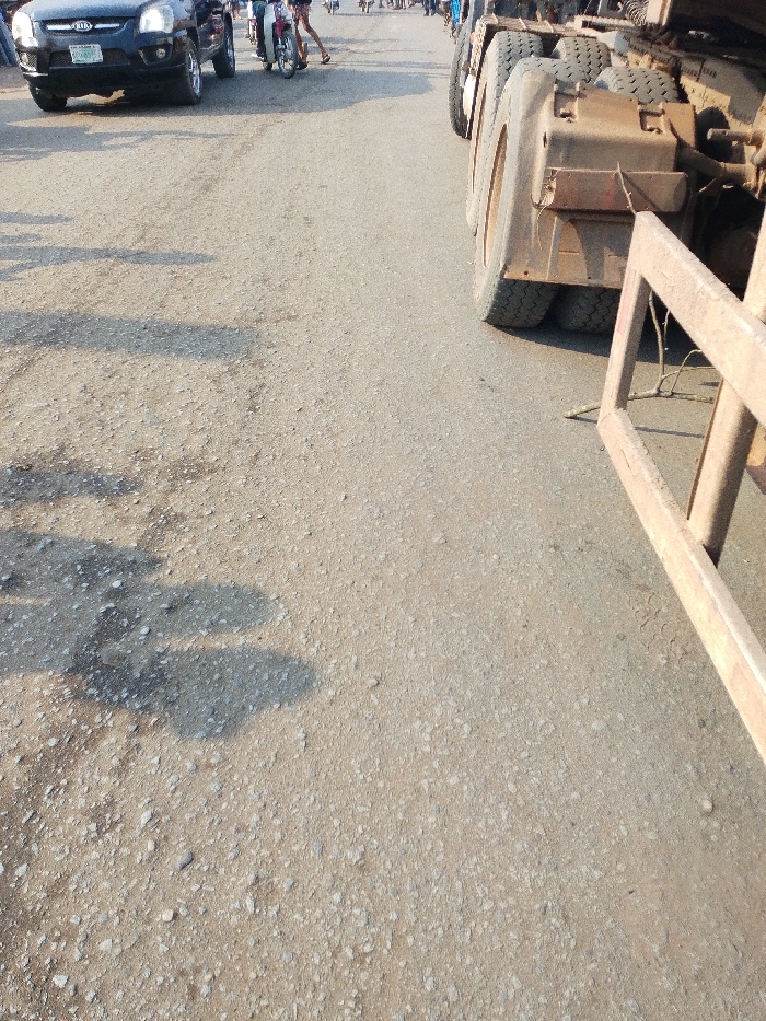 An outdoor scene shows a road with various vehicles. A black KIA SUV is visible in the upper left. A motorcycle with a rider is further down the road. A large truck or trailer with multiple wheels is positioned on the right side. A metal frame is partially visible on the right foreground. The road's surface is uneven, with patches and shadows. People are visible in the background. The scene appears to be during the day, with sunlight casting shadows on the road.